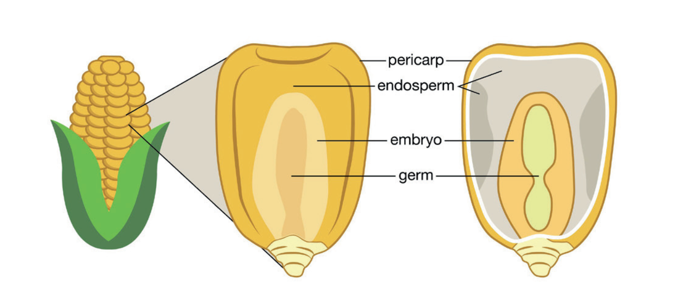 Embriyo: Mısır ekimi, yetiştirme ve gelişimine ilişkin enzim ve besin değerlerinin yanı sıra yüksek yağ oranına (%33.3) sahip olan kısmıdır.